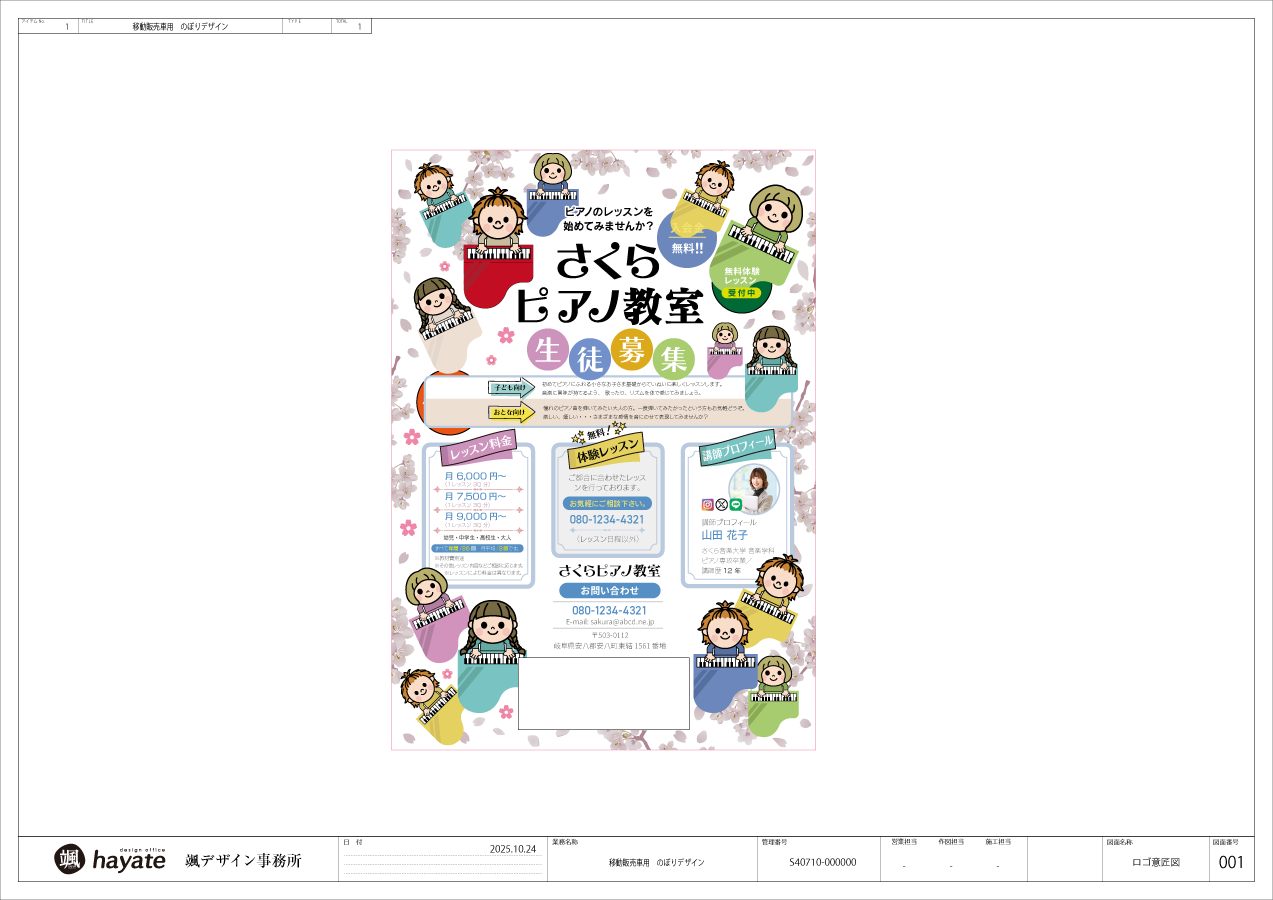 「さくら」と「ピアノ」をテーマに、生徒さんが「ピアノって楽しそう!」と感じてくれるような、優しくて温もりのある世界観を表現したフライヤーにまとめてみました。パッと目を引く「にぎやかで可愛いイラスト」を用いて生徒さんに親しみやすさを伝えています。桜のモチーフを全体に散りばめ、堅苦しい印象がなく、初めて習い事を始める生徒さんに「安心感」と「親しみやすさ」と一目でピアノ教室の習い事案内って感じられるデザインになるよう制作致しました。